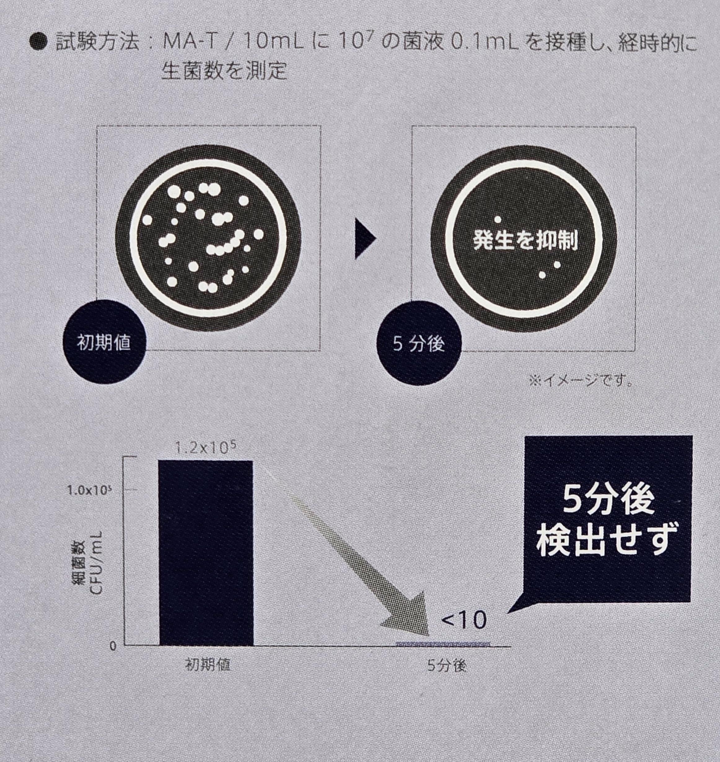 MA-Tは各種試験においても低い濃度で様々な菌やカビを除菌できることが確認されてします