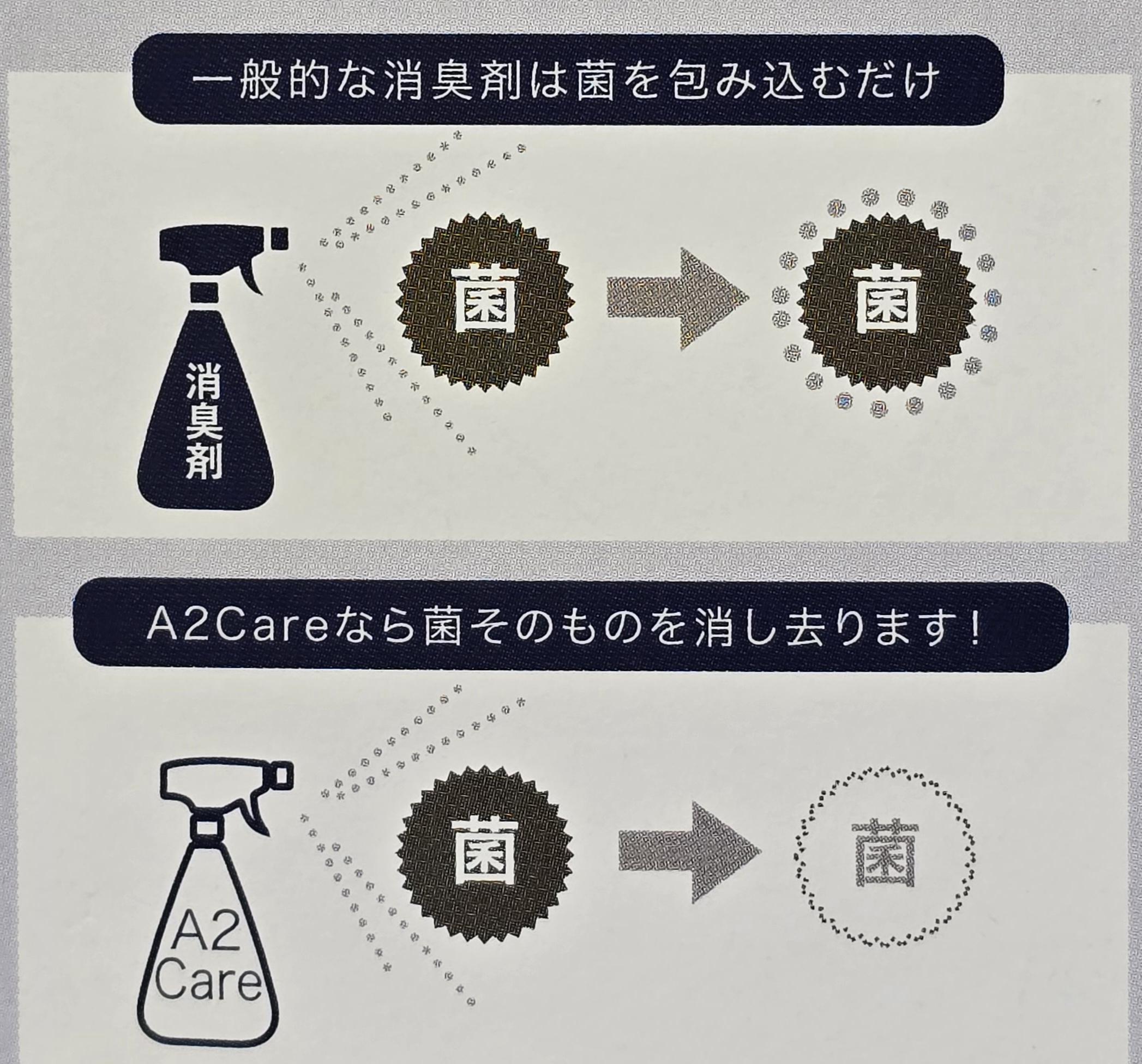A2Careは、臭いの元となる菌を取り除く働きがあり、菌を元から除去します